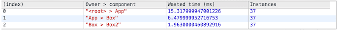 Perf.stop()Start/stop the measurement. The React operations in-between are recorded for analyses below. Operations that took an insignificant amount of time are ignored.